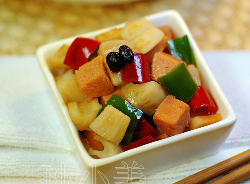 原料:藕40g 火腿腸40g 青辣椒40g 紅辣椒40g