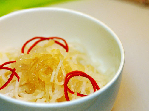 原料:白蘿蔔150g 海蜇70g 紅辣椒5g