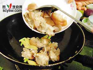 6 待鍋內滴豬腳湯汁呈濃稠狀,淋入生粉水勾芡,便可盛入碟中。