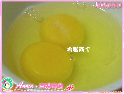 3、熱鍋入油,油熱後倒入雞蛋煎,煎到七分熟時就裝出,一會兒還要回鍋滴,不用完全煎熟!(注意別煎過煎糊哦)