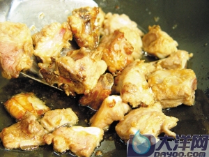 2、炸排骨時,由於醃製排骨時有汁,排骨放入油鍋中後,會不斷濺起油花燙傷手,應先戴上膠手套,再開始炸排骨。