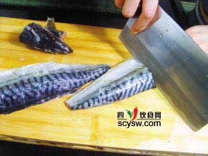 3、將青花魚的脊骨剔去後,用斜刀將魚腹的骨頭剔除,烹調後的青花魚會沒有魚刺,很適合老人和小孩食用。