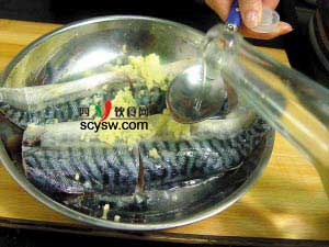 4、超市賣的青花魚多為冷凍的,魚腥味較重,可加入米酒和薑末醃製去腥,如果是新鮮的青花魚,則可不放米酒和姜。