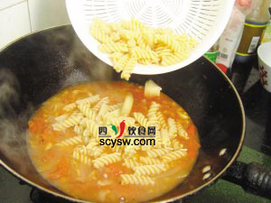 2、要使煮好的意粉爽口彈牙,就一定要在沸水中加鹽,放入意粉煮至軟硬適中,撈起過冷河即成。