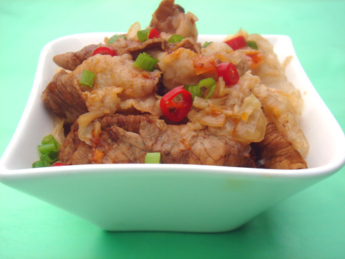 4、將醃好的羊肉片碼放在酸菜上輕輕拌勻,羊肉好熟,熟了即可,灑上紅椒圈,香蔥點綴