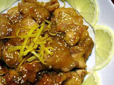 4.在新鍋中放入半鍋勺鮮湯(甜味的優佳),加鹽、白糖、檸檬汁以及番茄(上述處理的)等燒沸後,加點濕澱粉使其濃稠後收汁。將炸好的雞肉片放入 翻炒片刻。(注意時間,翻炒過久會焦糊的...)