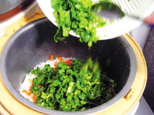 4:將菠菜也倒入煮好的米飯上,用勺子攪拌均勻,蓋上鍋蓋燜15分鐘。