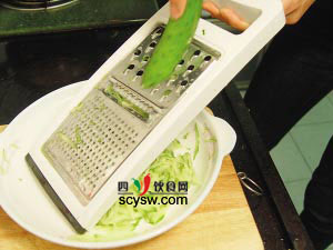 3 日本小青瓜洗淨拭乾水,放在刨絲器上刨成細絲待用