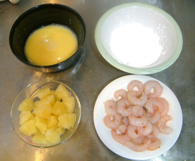 材料:鳳梨半個,蝦500克,雞蛋2個,太白粉1匙,麵粉、沙拉醬、米酒、色拉油適量