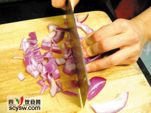 1 洋蔥剝皮洗淨,切成丁狀;火腿腸也切丁狀。