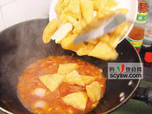 豆泡,又叫油炸豆腐,即將豆腐放入滾油中,炸至豆腐內部膨空,外部焦脆金黃而成。由於炸過的豆腐質地脆而實,可以久煮不爛。用番茄汁來煮豆泡,將吸飽茄汁的豆泡送入口,不僅酸甜可口,還十分下飯。