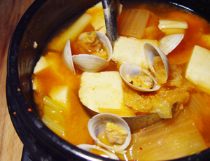 2,在砂鍋或石鍋裡倒入足量水,然後盛入一些韓國大醬放入湯中,攪拌均勻後,再點火。水呢,最好是用淘米的水.就是把米沖洗去浮土後,在水中揉搓米,這樣水就變白,用這樣的水做湯比較正宗.