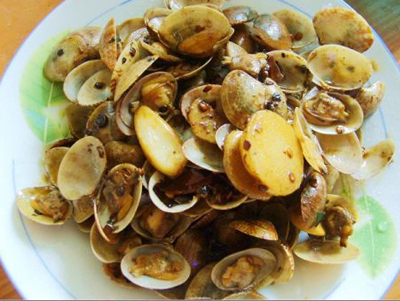 3 炒至所有的蛤蜊都張開殼,撒少許雞精,即可出鍋裝盤。